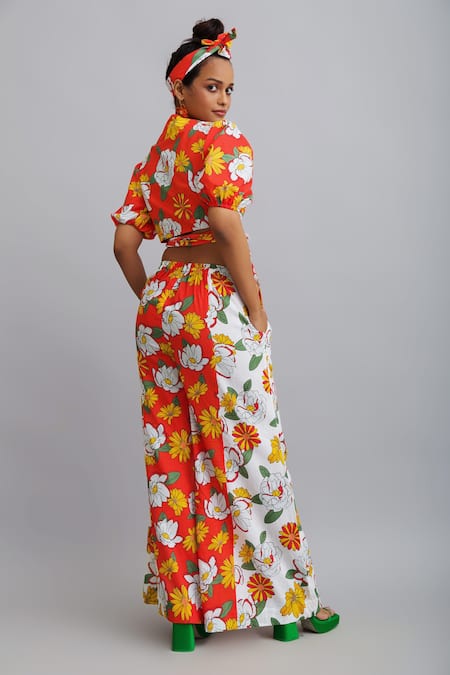 Tangy red puff sleeve crop top with hibiscus & firangipani printed motifs. Paired with printed pant.