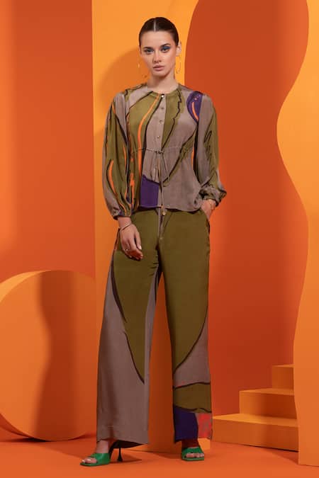 Olive and purple tie-up shirt featuring abstract geometric prints and a round neckline. Paired with relaxed fit trousers that complement the top's design.