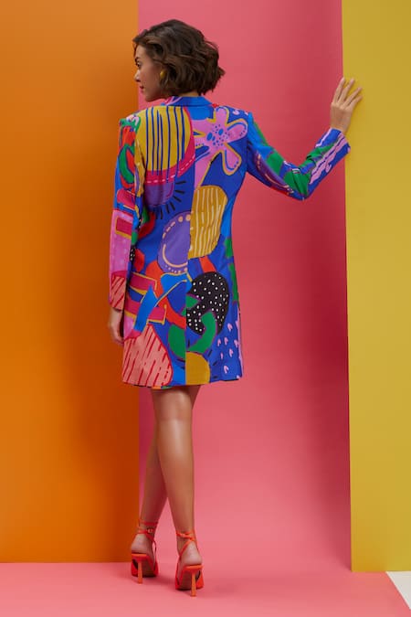 Blue Crepe Cowl Neck Unfazed Abstract Print Blazer With Slip Dress