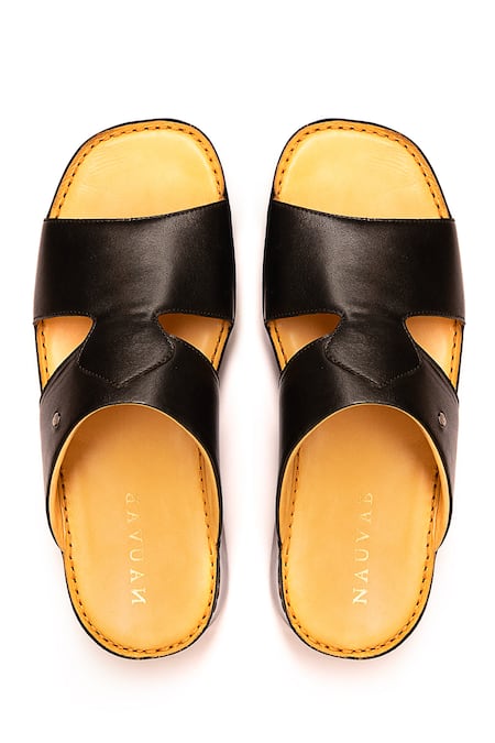 Black leather Arba Minar sandals featuring dual straps and a comfortable footbed