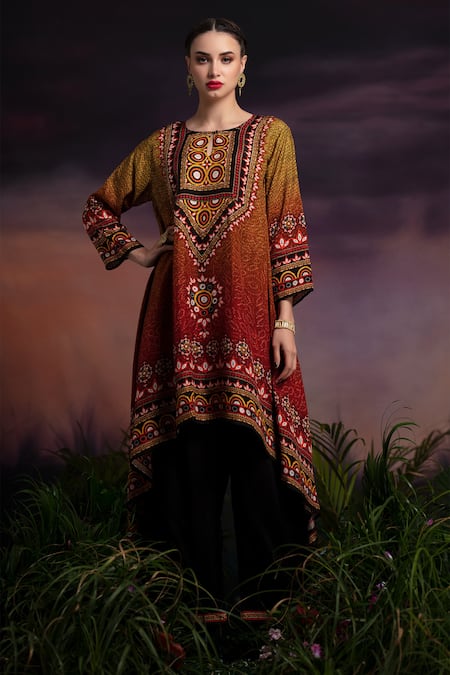 Red & green tunic all-over printed motifs, asymmetric hem & keyhole neck. Comes with palazzo pants.