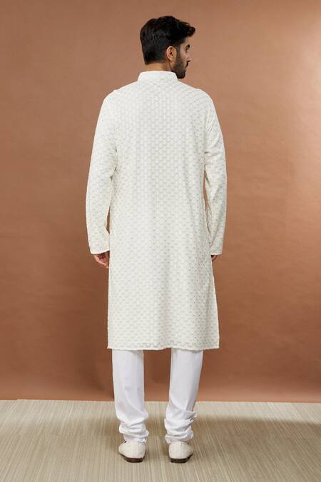 Off white kurta featuring floral embroidery with sequins and a mandarin neckline. Paired with a coordinating churidar in white.