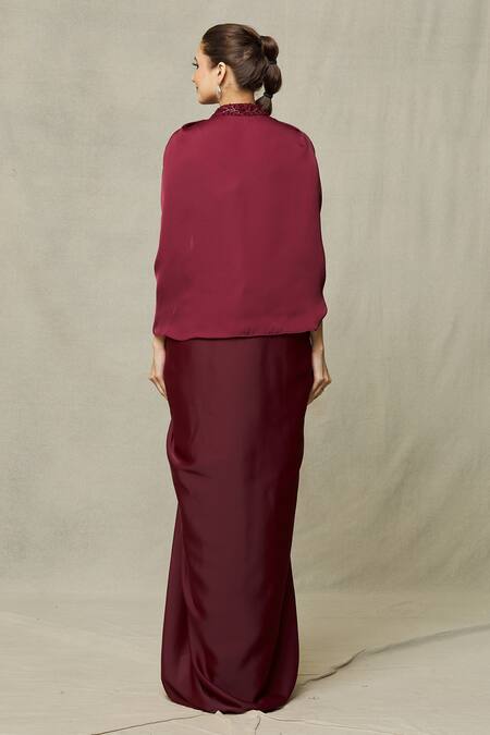 Maroon draped gown featuring a sweetheart neckline and noodle strap on the shoulder. Paired with a matching cape with a mandarin collar and flared sleeves, both adorned with intricate bead, cutdana, and sequin embroidery in a floral pattern.