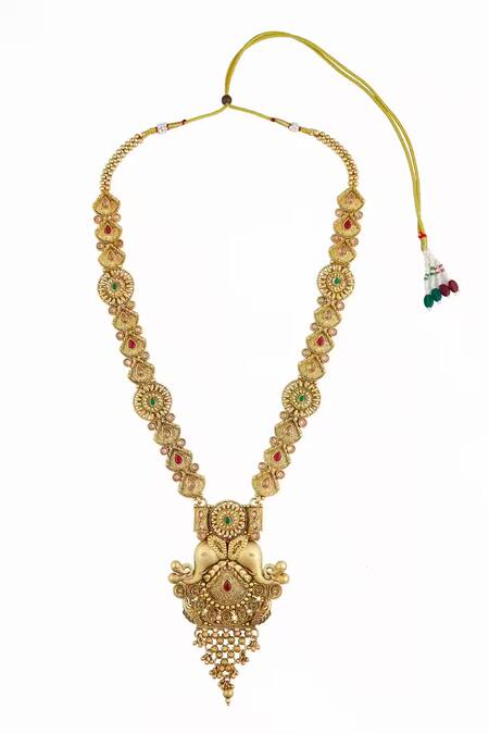 Gold elephant motif choker featuring carved details and stone embellishments. Includes a long necklace with pendant drop, dangler earrings, and a maangtikka.