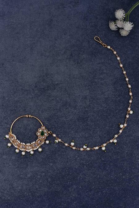 Buy_Nazaakat By Samara Singh_Gold Plated Piping, Stones Flower Carved Nose Ring_at_Aza_Fashions