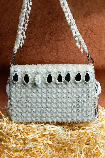 White box shaped potli bag adorned with sparkling mirrors, delicate pearls & intricate bead work
