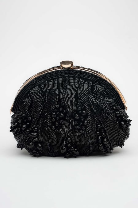 Black potli bag featuring intricate bead, cutdana, and crystal drops embroidery