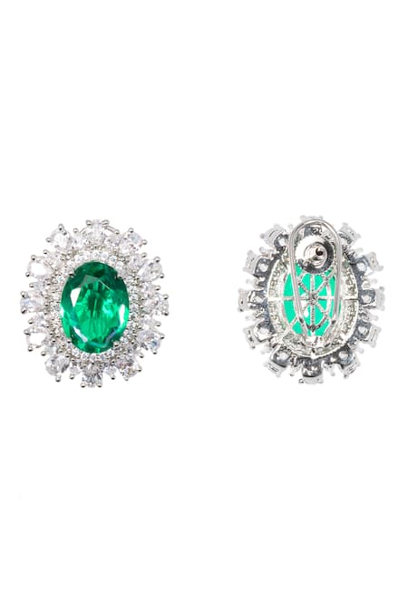 Silver toned stud earrings featuring semi-precious emerald stones surrounded by faux diamonds. Designed in a contemporary style with a push-back closure.