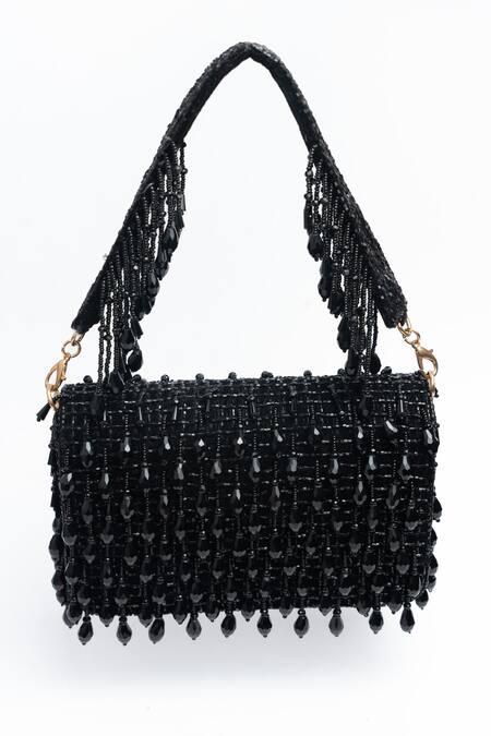 Black box clutch featuring intricate crystal embroidery and a detachable tasseled handle