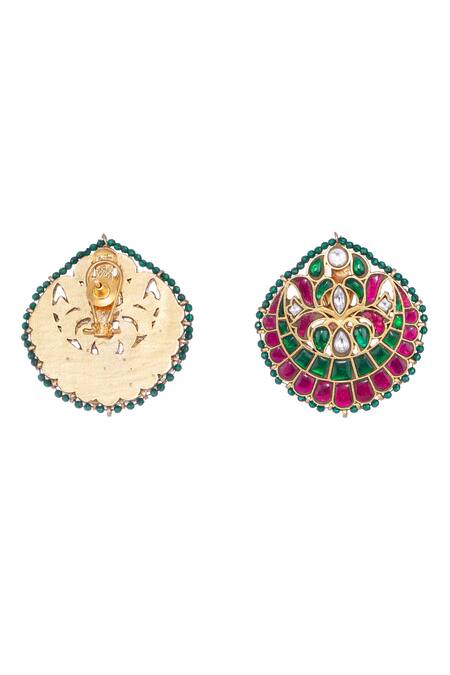 Gold toned crest studs featuring pink and green jadau kundan embellishments