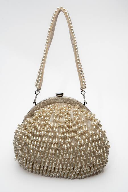 White clutch encrusted with pearl drops and transparent bead embellishments