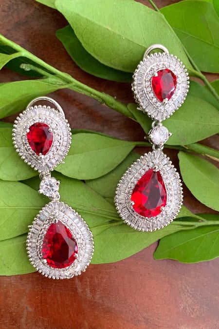 Silver toned tear drop shaped earrings featuring cubic zirconia diamond and red semi-precious stone embellishments