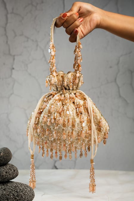 Cream potli bag featuring an embroidered base on silk with a detachable handle. The bag includes intricate bead embellishments for added elegance.