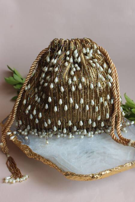 Gold Embellished Silk Pearl Potli
