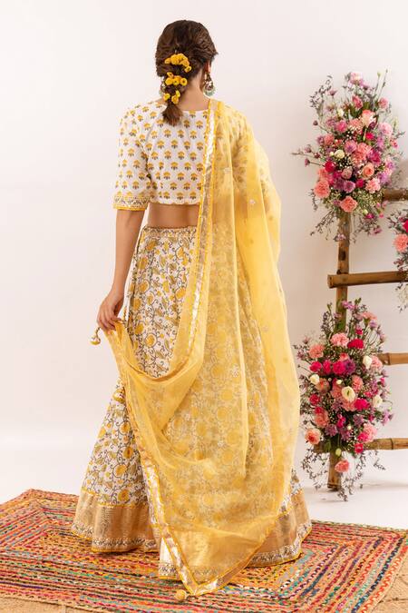 White, yellow floral printed, attached can can lehenga with sequins highlights and gota detailing. Paired with matching blouse & dupatta.