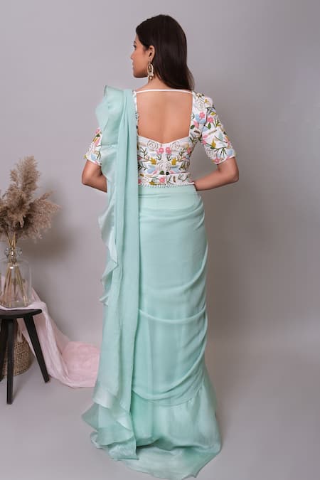 Mint pre-draped saree featuring a ruffle border and attached draped pallu. Paired with an ivory sweetheart neck blouse adorned with floral pattern and multi-color sequin, thread, beads, and cut dana embroidery, along with a belt.