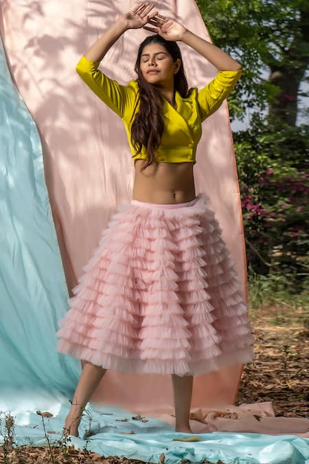Lime cropped blazer with lapel collar. Comes with pastel pink layered ruffle tulle skirt.