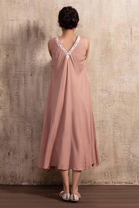 Pink Modal Cotton V Neck Embroidered Midi Dress