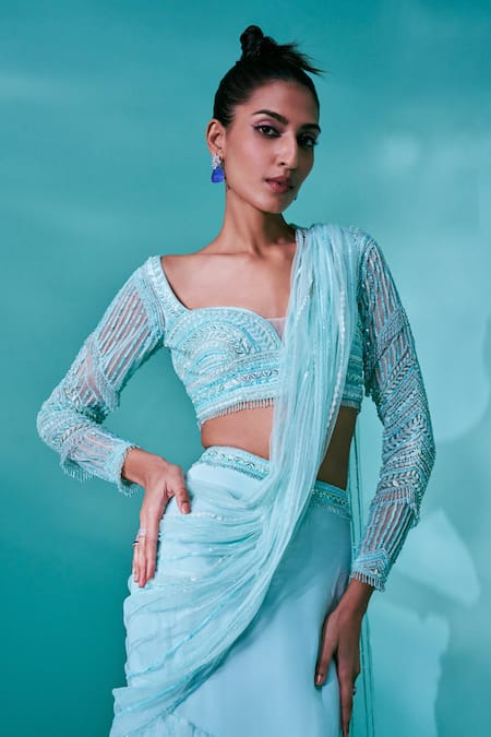 Sea green skirt saree featuring a layered ruffle trail and tonal sequin & bead hand embroidery. Paired with an embroidered padded blouse with bead tassel details and a sweetheart neckline.