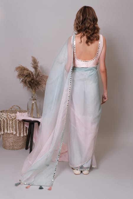 Peach organza saree featuring triangle cut work mirror hand embroidered border. Paired with a raw silk blouse with a round neckline and a petticoat.