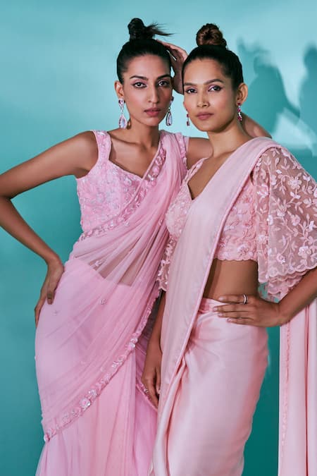 Buy_Nayantaara_Pink Net, Silk Embroidery Sweetheart Neck Floret Pre-draped Saree With Blouse _Online_at_Aza_Fashions