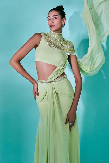Green pre-draped saree featuring overlap pleated draped panels and an embroidered trail pallu. Paired with a high neck capelet adorned with metallic cut dana and sequin hand embroidery, along with a one shoulder neck padded blouse.