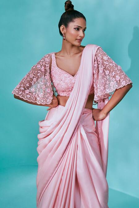 Buy_Nayantaara_Pink Satin, Georgette, Net, Silk Sequins, Beads, Love Potion Saree Cape Set _Online_at_Aza_Fashions