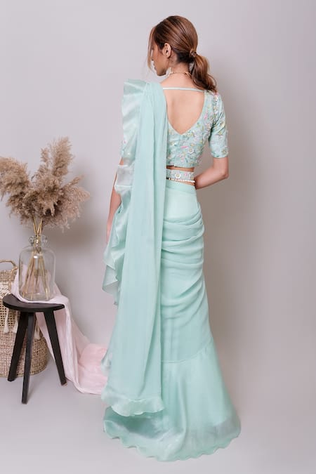 Mint pre-draped saree featuring a ruffle border and attached draped pallu. Paired with a V neck blouse adorned with floral patterns and multi-color sequin, thread, beads, and cut dana embroidery.