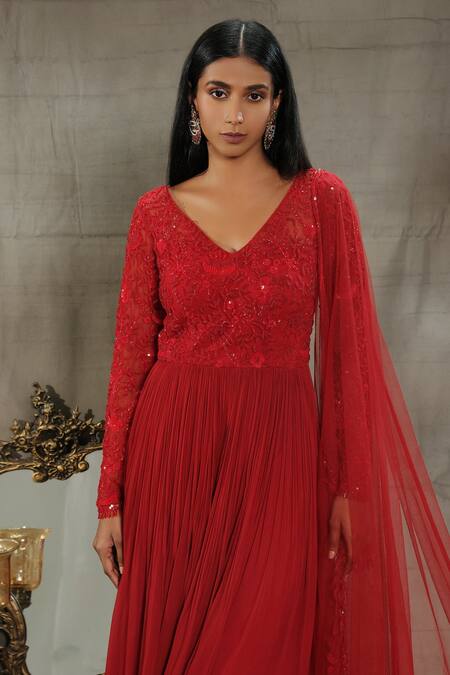 Red Anarkali featuring full sleeves and a V neckline with hand embroidery. Paired with a churidar and a dupatta that has a beaded tasselled hem.