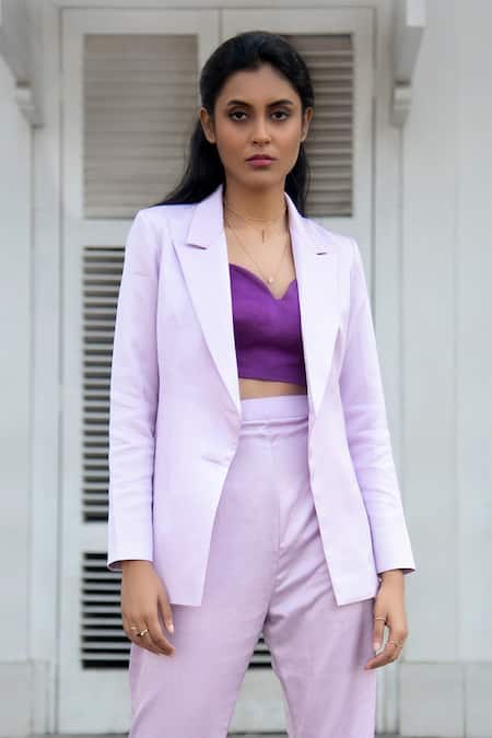 Lilac bell bottom pant with high waist. Comes with crop top and blazer.