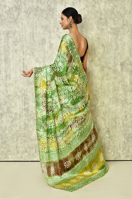 Green saree featuring abstract linear digital prints. Comes with a running blouse.