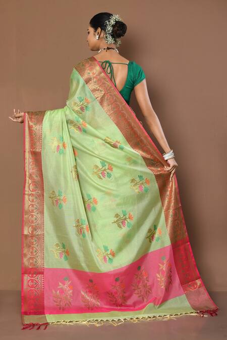 Pista green saree featuring multi-colored alfi jaal floral woven patterns and a fringed hem palla. Paired with a running blouse in silk blend.
