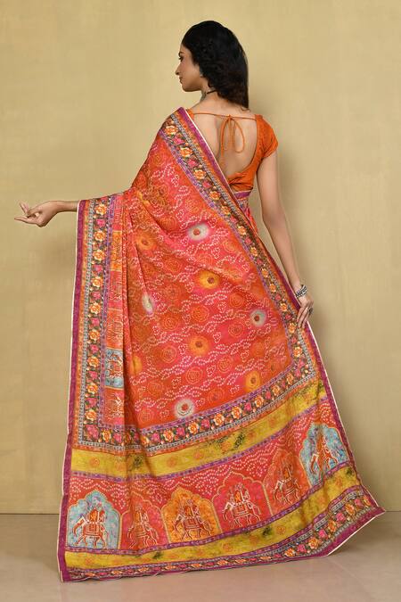 Orange saree featuring pure digital printed bandhani, floral, and animal patterns. Comes with a running blouse made of natural silk with jacquard zari.