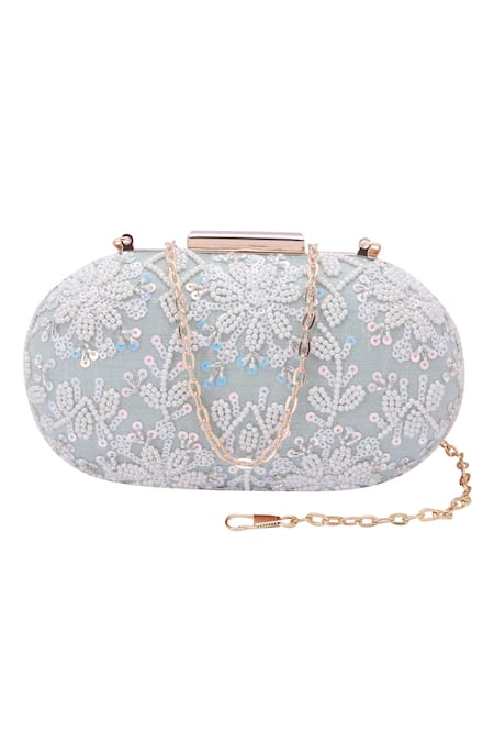 A light blue silk clutch bag featuring intricate white beadwork and iridescent sequin embroidery in a floral pattern.
