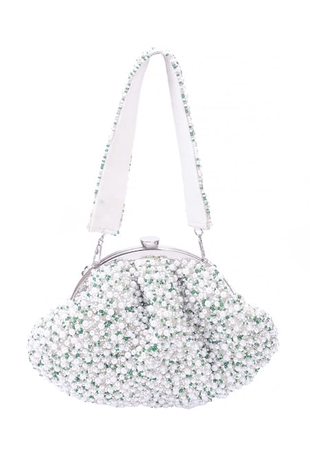 A white and green batua bag crafted from silk, featuring an all-over intricate embellishment of white pearls and green beads.