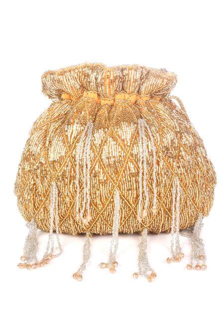 A golden silk potli bag featuring all-over intricate beadwork in a diamond pattern.