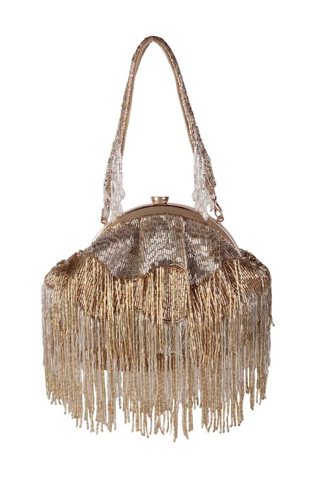 Buy_Nazaakat By Samara Singh_Gold Beads, Tassels Beaded Fringe Batua Bag With Detachable Handle _Online_at_Aza_Fashions
