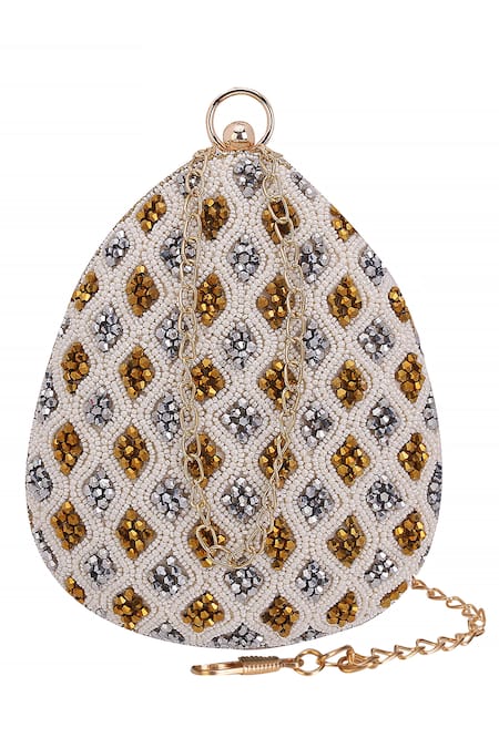 Cream Beads, Sequins Beaded Geometric Pattern Clutch With Sling