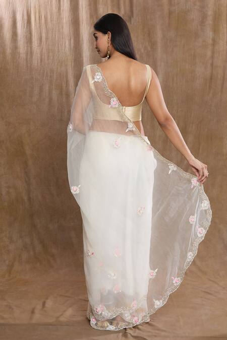 Off white saree featuring floral, beads, and sequins hand embroidery. Paired with a running blouse measuring 80 cms.