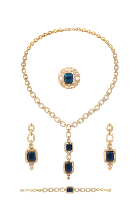 Blue embellished necklace featuring brass and American diamond components. Includes a matching pair of earrings, a ring, and a bracelet.