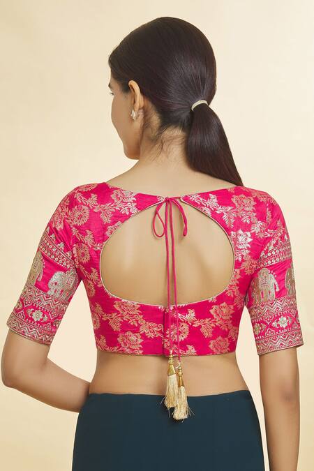 Buy_Samyukta Singhania_Pink Jacquard Embroidery V-neck Botanic Pattern V Blouse_Online_at_Aza_Fashions