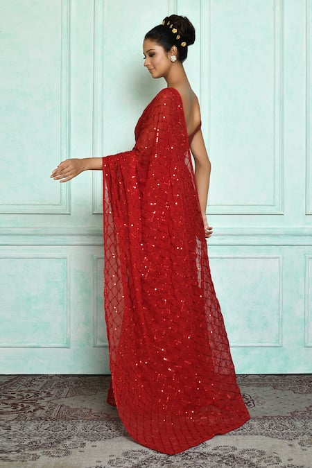 Red saree featuring all-over sequin embroidery in a checkered pattern. Comes with unstitched blouse fabric in Bangalore silk.
