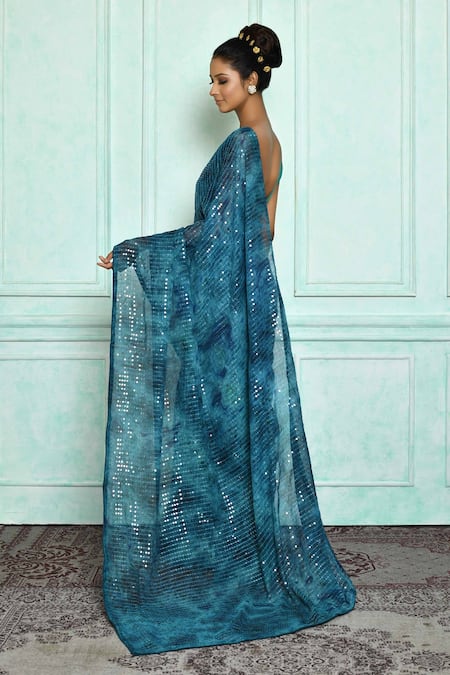 Buy_Samyukta Singhania_Blue Chiffon, Satin, Brocade Sequins Round Neck Prism Pattern Embroidered Saree_at_Aza_Fashions
