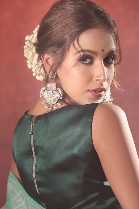 Green organza saree featuring paisley lucknowi zari motifs. Comes along with a running blouse piece.