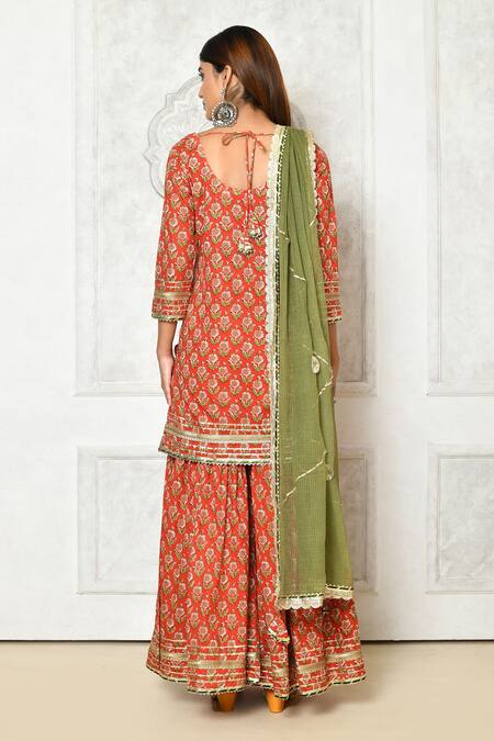 Buy_Samyukta Singhania_Red Cotton Embroidery Round Neck Straight Kurta Flared Pant Set_Online_at_Aza_Fashions