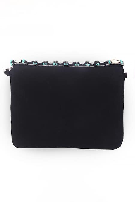 A black silk Banjara Boho bag featuring cowrie shells, turquoise beads, and mirror embellishments with a flap closure and a detachable chain strap.
