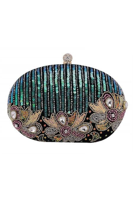 A black silk clutch bag featuring a sequin pattern in shades of blue and green, with floral motifs embellished with multi-colored beads and clear teardrop stones.