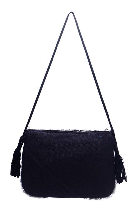 Intricate floral embroidery with sequins and beads, Coin embellishments along the flap and bottom edge, Fringed edges and side tassels
