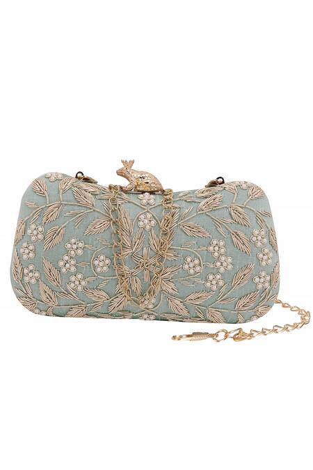 Aqua Embroidery, Pearls Floral Clutch With Frog Closure