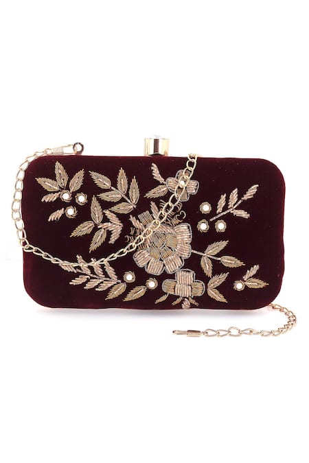 A maroon velvet clutch featuring intricate gold-toned floral embroidery and pearl embellishments.